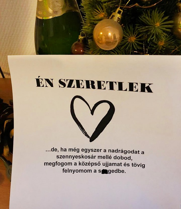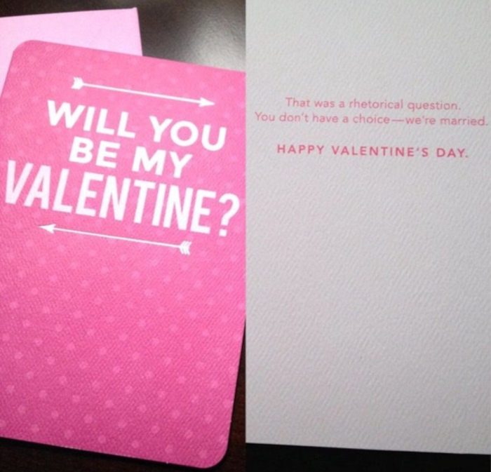 8. A feleségemtől ezt a lapot kaptam február 14-én: „Leszel a Valentinom? Ez csak egy költő kérdés volt. Nincs választásod, mivel házasok vagyunk. Boldog Valentin napot.”