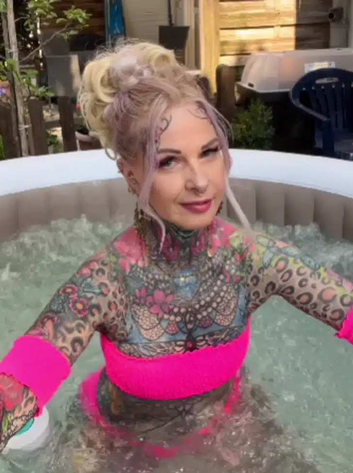 A német influencer fényes rózsákat ábrázoló képeket visel a lábán, egy leopárdtetoválást a vállán és több részletes portrét a karján. Ezek a tetoválások több tucat más mellett vannak szerte a testén.