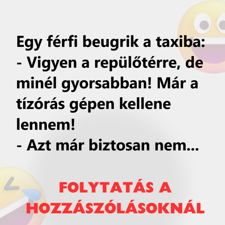 Egy férfi beugrik a taxiba: – Vigyen a repülőtérre, de minél gyorsabban! Már a tízórás gépen kellene lennem! – Azt már biztosan nem fogjuk elérni. Azok a gépek mindig pontosan indulnak. – Igaz, de nem ez a gép! Ugyanis én…