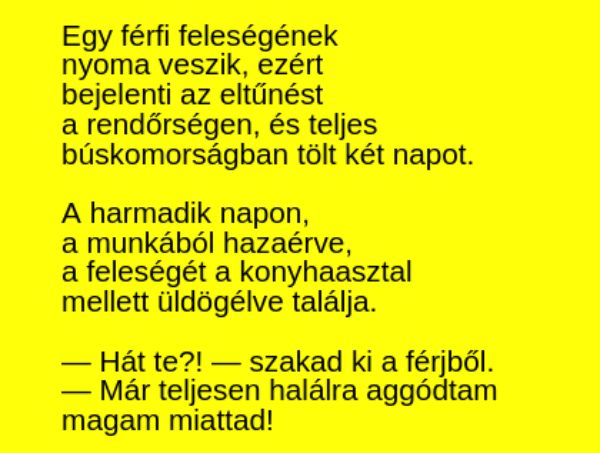 Egy férfi feleségének nyoma veszik, ezért bejelenti az eltűnést a rendőrségen, és teljes búskomorságban tölt két napot. A harmadik napon, a munkából hazaérve, a feleségét a konyhaasztal mellett üldögélve találja. — Hát te?! — szakad ki a férjből. — Már…