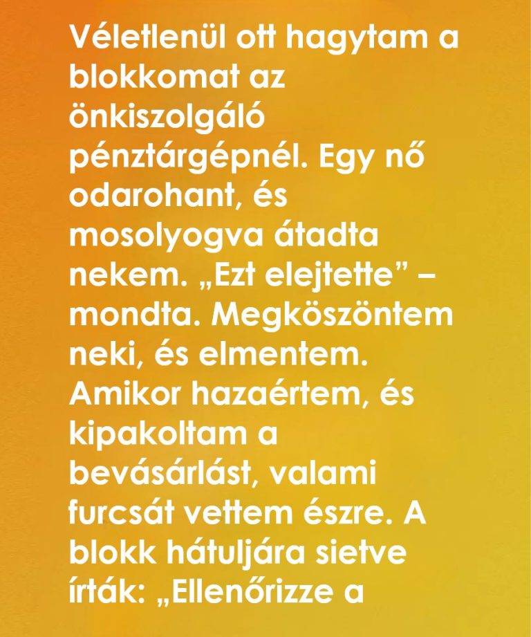 Az önkiszolgáló kasszánál végeztem, de a blokkot ott felejtettem. Egy nő sietve utánam lépett, és finoman intett a papírral. „Elejtette” mondta mosolyogva. Megköszöntem, a táskámba csúsztattam, aztán hazamentem. Nem tulajdonítottam neki nagy jelentőséget. Este, amikor kipakoltam a bevásárlást, valami furcsa…