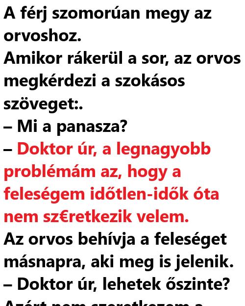 A férj szomorúan megy az orvoshoz. Mikor rá kerül a sor, az orvos megkérdezi a szokásos szöveget (mi a panasza?) A férj válaszként ezt mondja: – Doktor úr, a legnagyobb problémám az, hogy a feleségem időtlen-idők óta nem szeretkezik velem.…