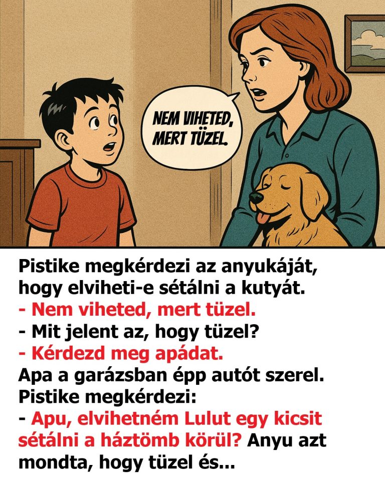 Pistike megkérdezi az anyukáját, hogy elviheti-e sétálni a kutyát. – Nem viheted, mert tüzel. – Mit jelent az, hogy tüzel? – Kérdezd meg apádat. Apa a garázsban épp autót szerel. Pistike megkérdezi: – Apu, elvihetném Lulut egy kicsit sétálni a…